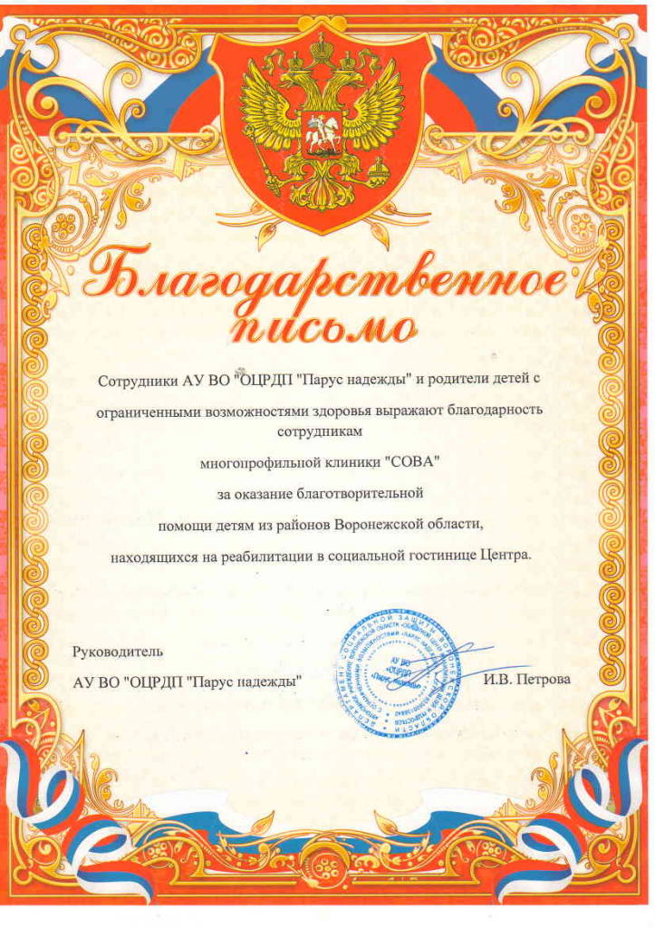 Ко Дню защиты детей сотрудники клиники «СОВА» в Воронеже провели благотворительную акцию и собрали деньги для Центра реабилитации детей с ограниченными возможностями «Парус надежды». Вся собранная сумма была направлена в помощь детям из районов Воронежской области, находящимся на реабилитации в социальной гостинице Центра.
