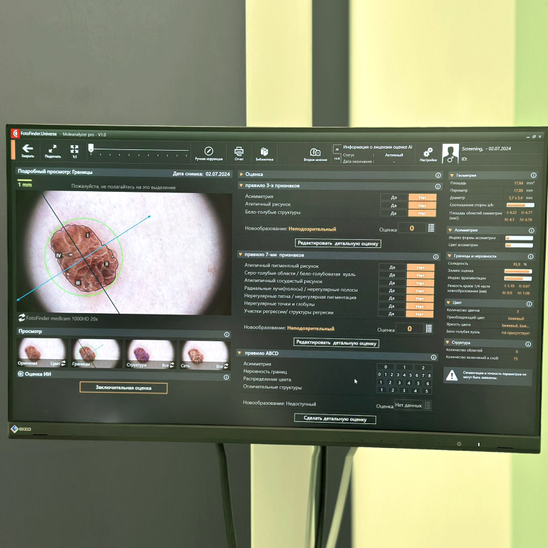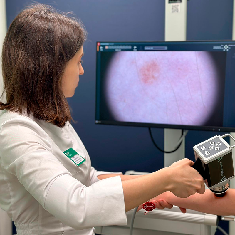 FotoFinder — это уникальный цифровой дерматоскоп, который помогает сохранять данные предыдущих исследований и сравнивать их с последующими. Это позволяет назначить лечение и определить дальнейшие процедуры. Аппарат обнаруживает онкологические заболевания на доклинических стадиях, когда изменения кожи ещё невозможно увидеть невооружённым глазом.
