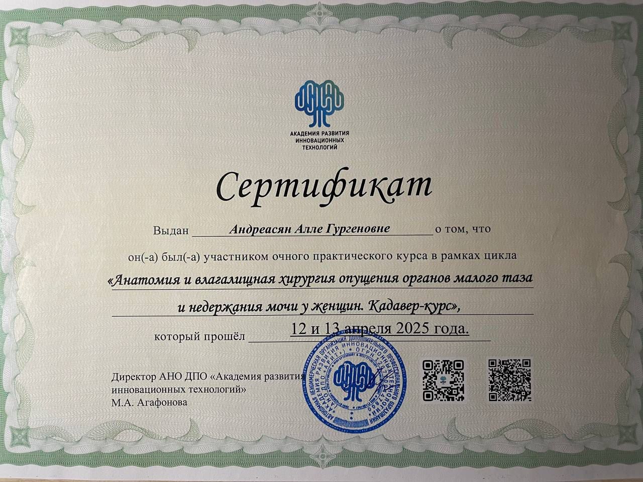 • «Анатомия и влагалищная хирургия  опущения органов малого таза и недержания мочи у женщин»,  АНО ДПО «АРИТ», г.Санкт-Петербург, 2025 г.