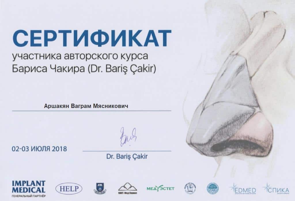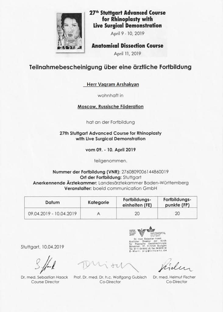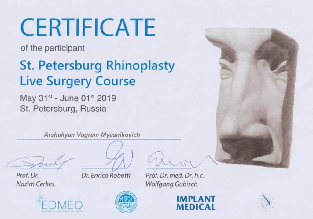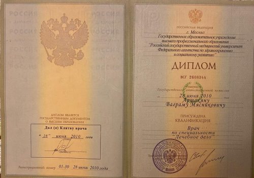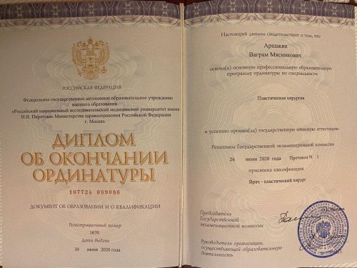 • "Пластическая хирургия", РГМУ им Н.И.Пирогова. Срок действия с 11.01.2021 г. по 11.01.2026 г.