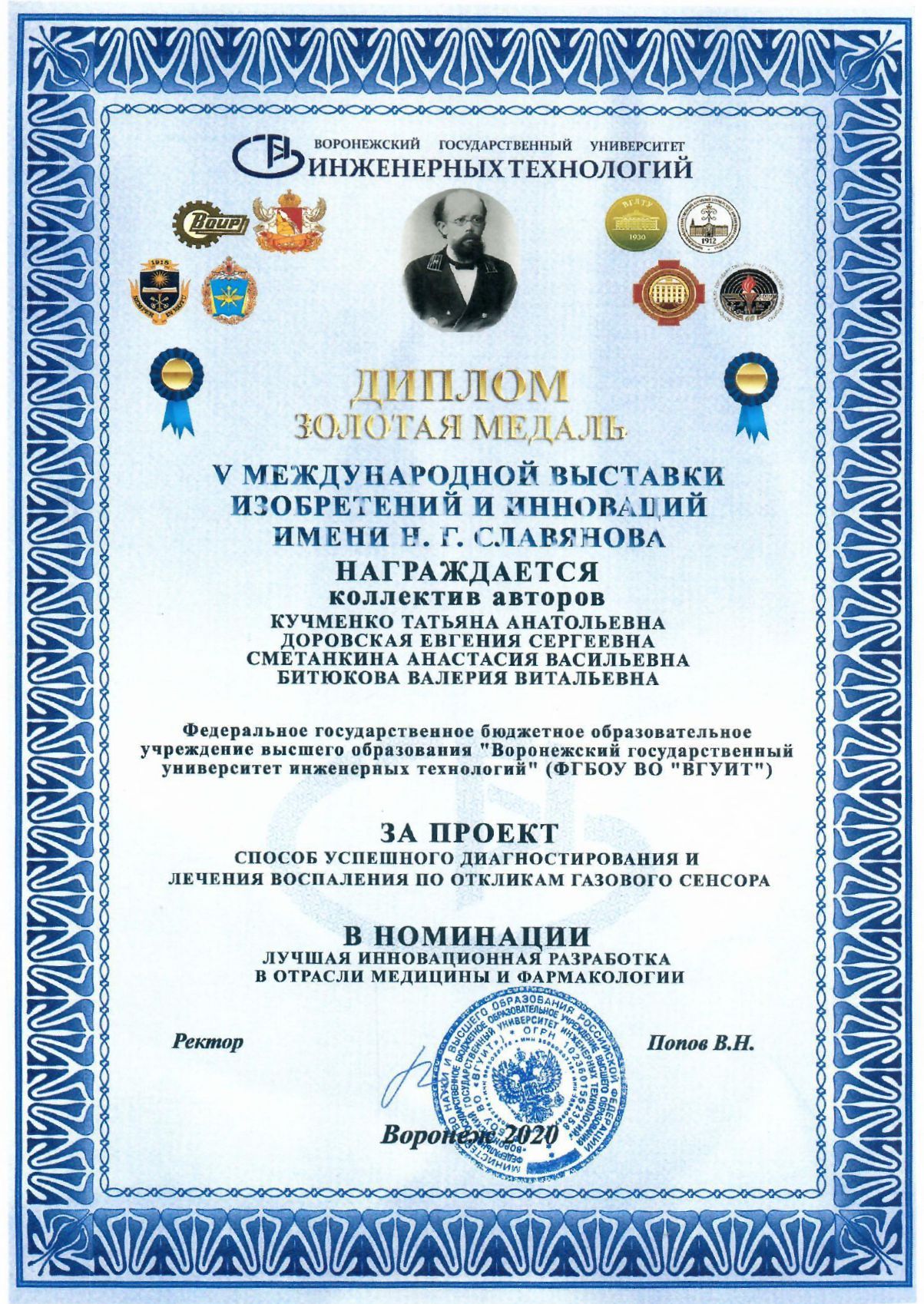 Битюкова В.В., Кучменко Т.А., Сметанкина А.В. «Оценка легколетучих органических соединений в диагностике хламидиоза»/«Evaluation of volatile organic compounds in the diagnosis of chlamydia» / В.В. Битюкова, Т.А. Кучменко, А.В. Сметанкина // Indo American Journal of Pharmaceutical sciences 2020. 07 (03), с 764-766.