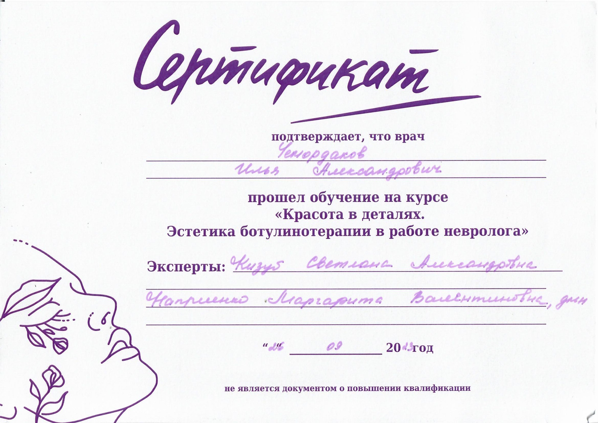 • Сертификат специалиста № 1178270039587 от 09.12.2020 г., срок действия 5 лет, выдан Автономной некоммерческой организацией дополнительного профессионального образования "Санкт-Петербургский университет повышения квалификации и профессиональной переподготовки", специализация «Неврология».