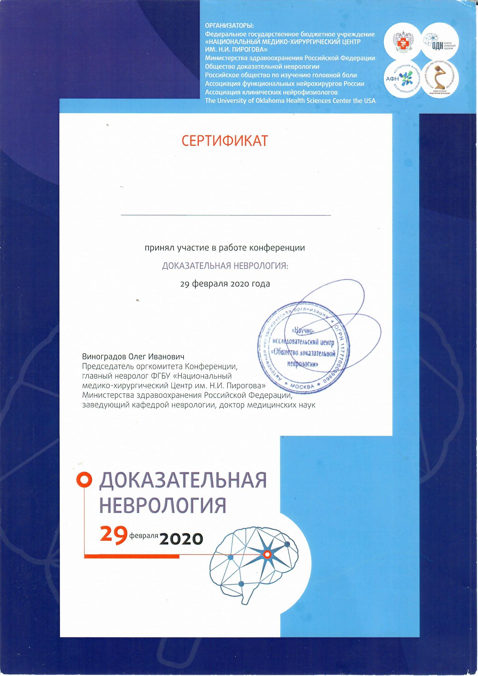 • Конференция "Доказательная неврология", ФГБУ "Национальный медико-хирургический центр им. Н.И. Пирогова" МЗ РФ, Общество доказательно неврологии, Российское общество по изучению головной боли, Ассоциация функциональных нейрохирургов России, Ассоциация клинических нейрофизиологов, The university of Oklahoma Health Siensec Center the USA, 29.02.2020