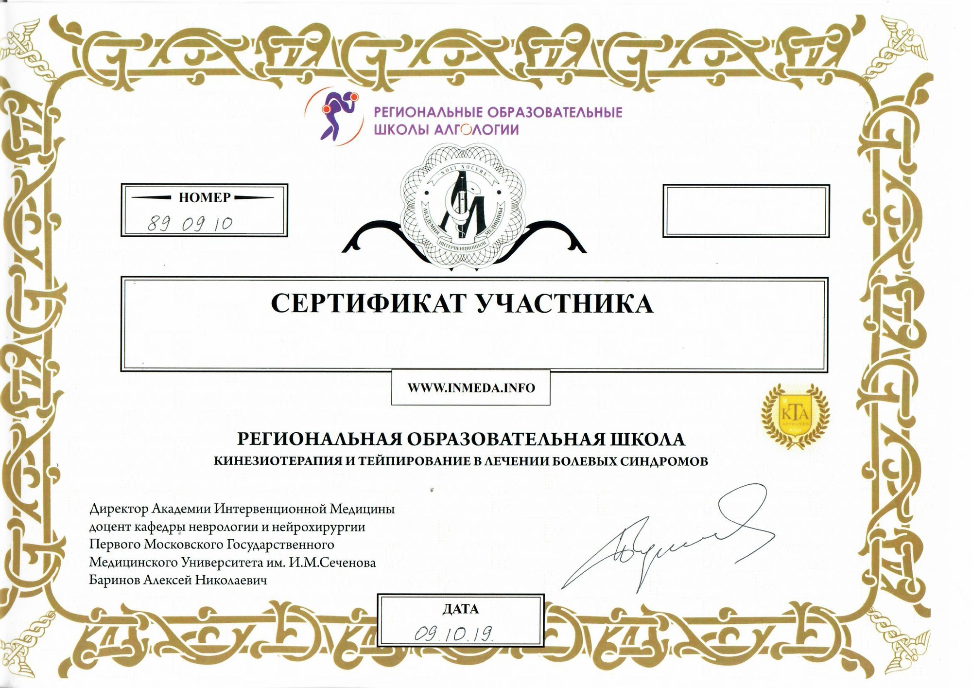 • Региональная образовательная школа "Кинезиотерапия и тейпирование в лечении болевых синдромов", Академия Интервенционной Медицины, 19.10.2019