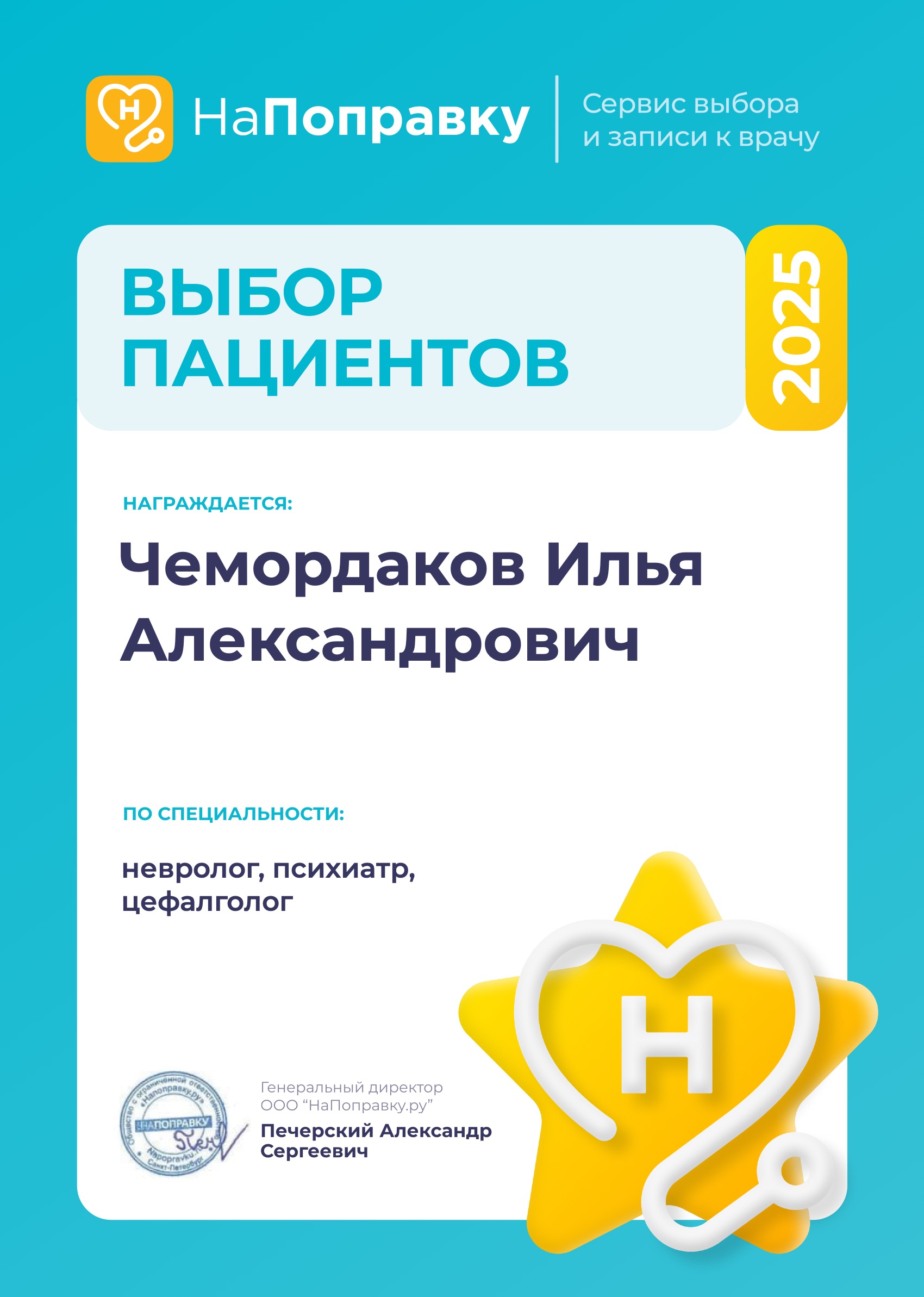Мой лечащий врач невролог Чемордаков, это лучший Доктор из всех у кого я наблюдалась за 15 лет заболевания! Очень рекомендую его!