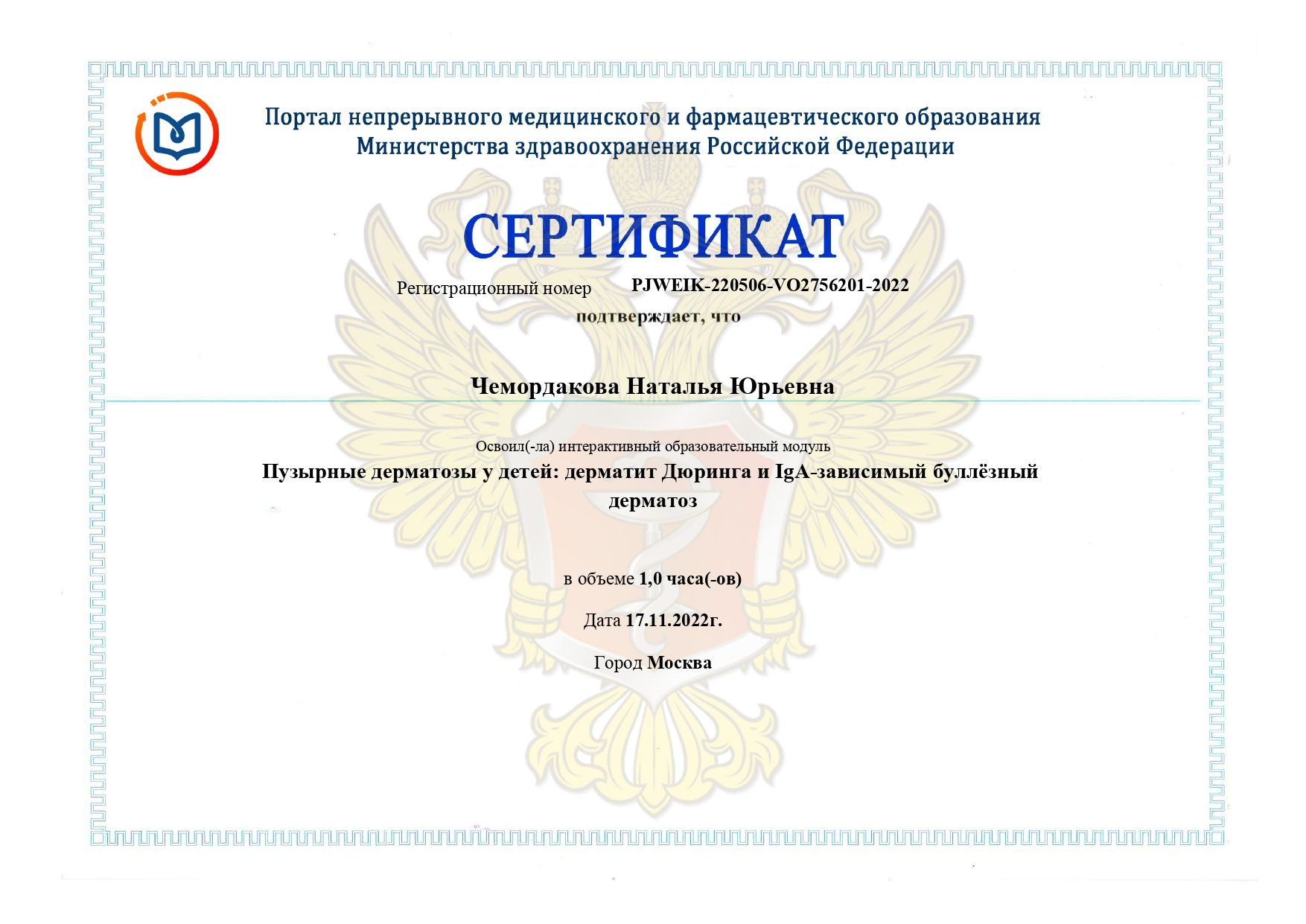 • Сертификат специалиста № 1178270038795 от 20.11.2020, выдан АНО ДПО «Санкт-Петербургский университет повышения квалификации и профессиональной переподготовки» по специальности «Дерматовенерология», действителен по 20.11.2025