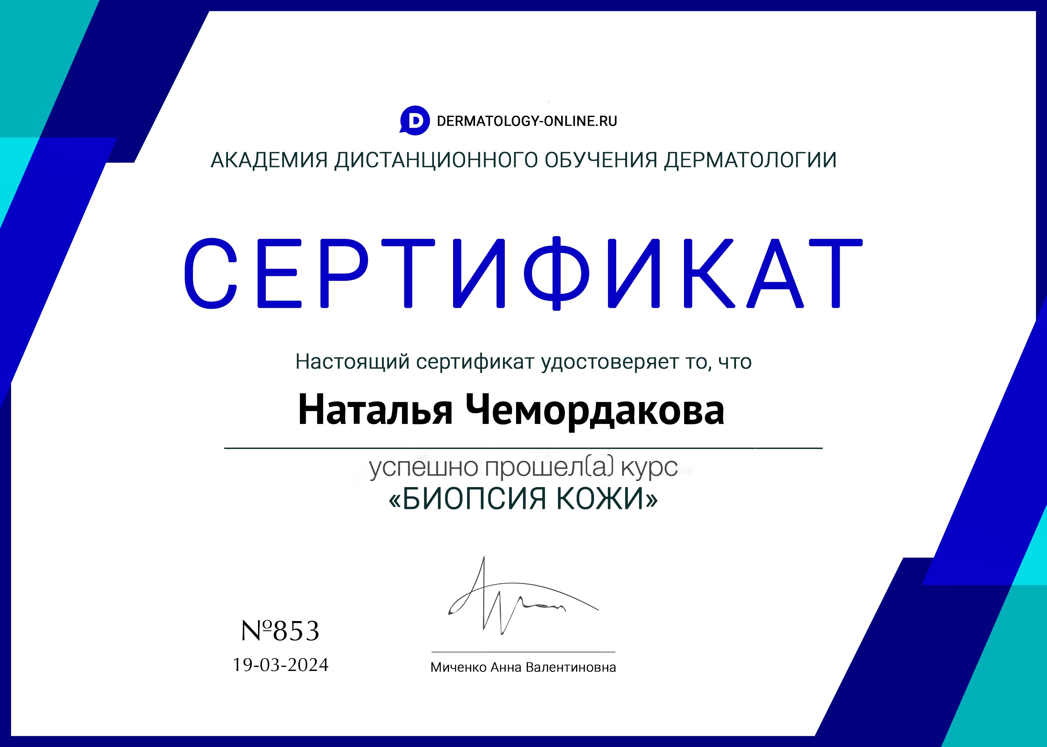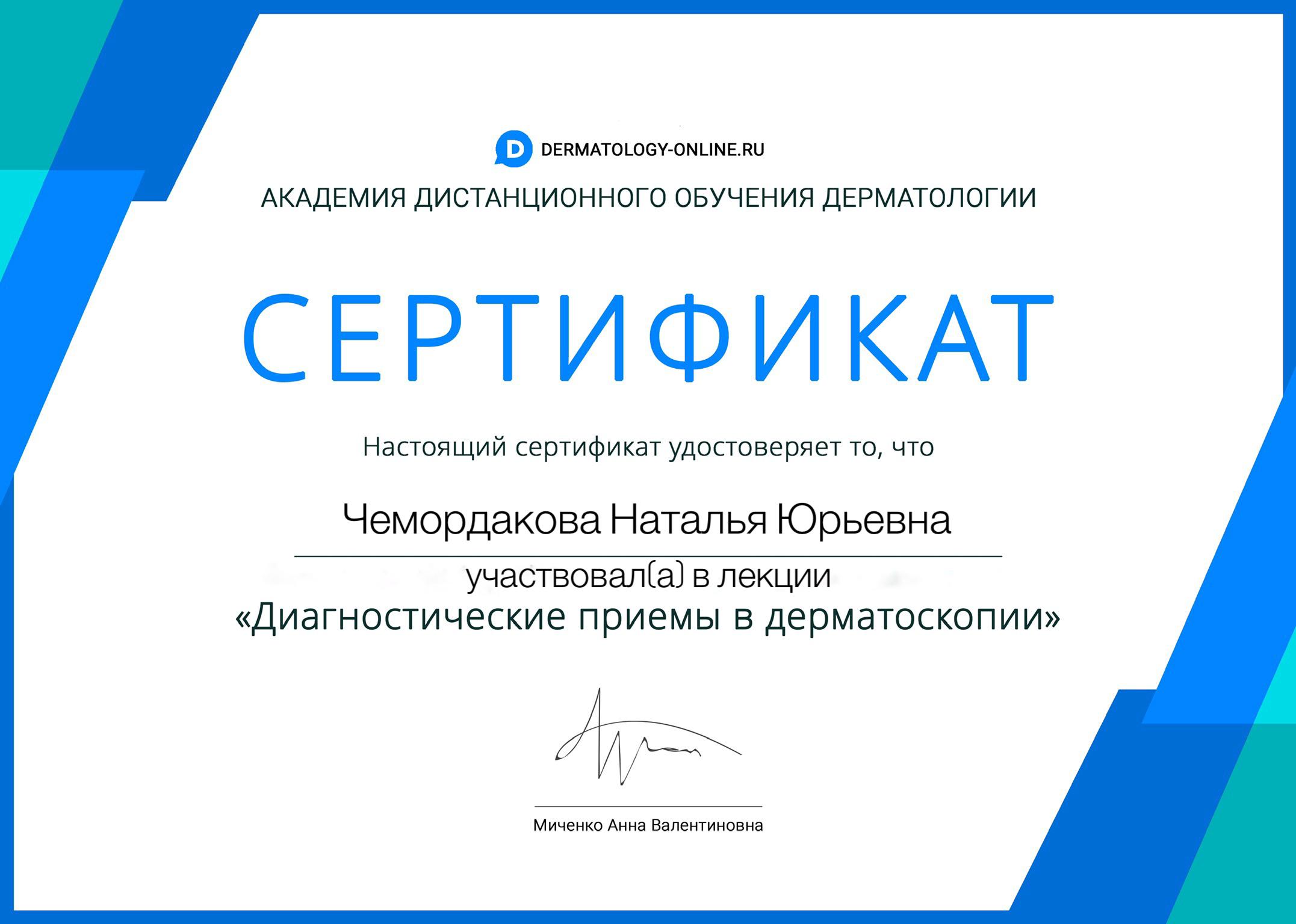 • Сертификат специалиста № 1178270038795 от 20.11.2020, выдан АНО ДПО «Санкт-Петербургский университет повышения квалификации и профессиональной переподготовки» по специальности «Дерматовенерология», действителен по 20.11.2025