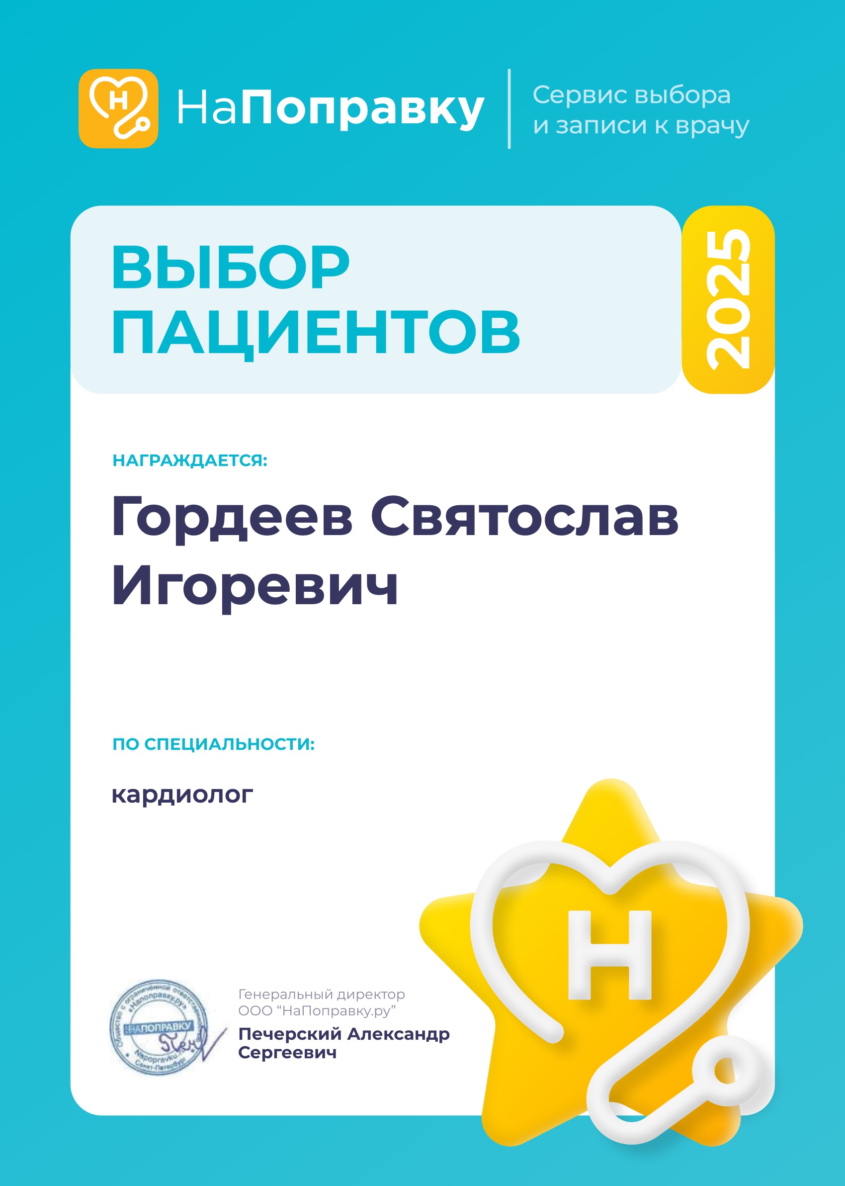 Гордеева Святослава Игоревича в качестве пациента посещал мой супруг. Он в первый раз обращался к этому кардиологу. Мы выбрали его по отзывам. Насколько я знаю, Святослав Игоревич принял супруга...