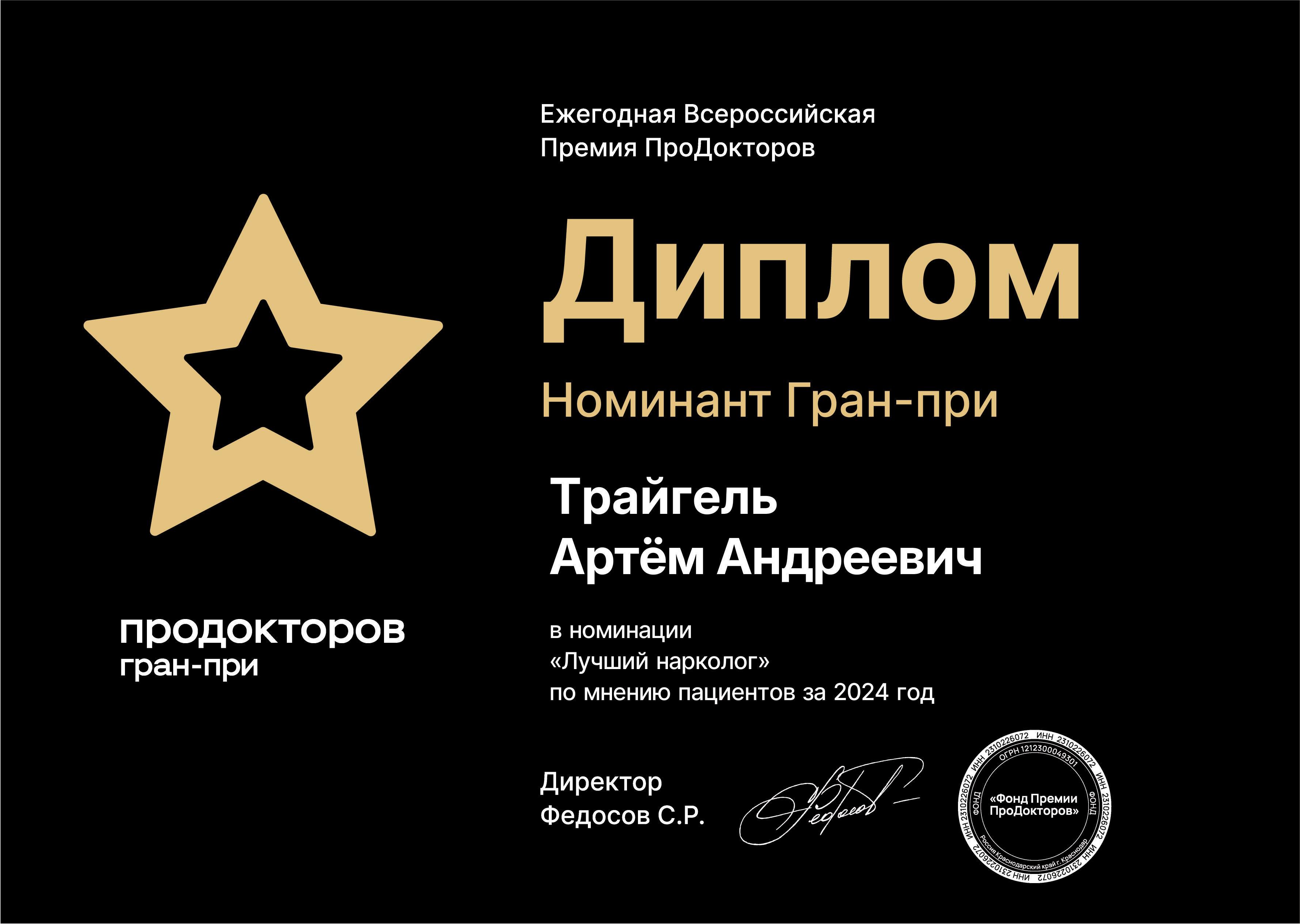 Призёр Гран-при Всероссийской премии ПроДокторов: 3 место в категории "Лучший нарколог".