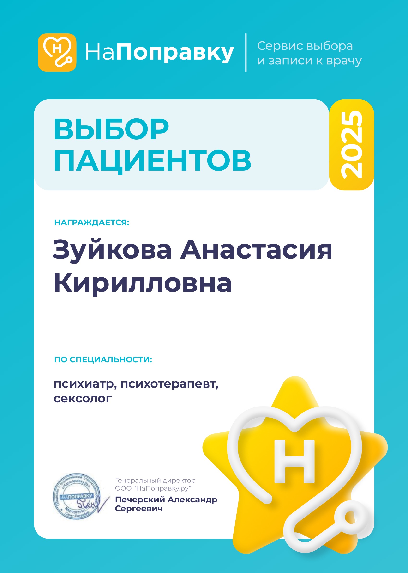 Давно была проблема с нехваткой сил и энергии, эмоциональная нестабильность. Терапия с психологом помогала, стало легче, но не до конца, посоветовали обратиться к специалисту, который сможет поддержать мою нервную систему медикаментозно. Узнала про нескольких хороших специалистов, среди которых была и Зуйкова А. К. К другим запись была только через 1-2 месяца, и стоимость приема дороже. Я очень рада, что так сложились обстоятельства, и я попала на приём к Анастасии Кирилловне. Очень понравилось отношение. Меня внимательно выслушали, поставили диагноз, выписали лекарства, направили дополнительно к терапевту, чтобы исключить другие факторы моего состояния. Спустя 3 недели после начала приема АД иду на повторную консультацию, чтобы скорректировать лечение. По ощущениям - результат небольшой, но есть.